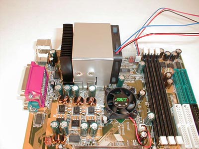 (you will only need to use two screws for this) of the heatsink and the fan direction reversed. Although they are exactly opposite of what the manual said to do, these two steps are necessary for this combo to work correctly on an Abit KT7 motherboard. The installed fan is now just barely touching as opposed to bending the capacitor. The fit is improved, but that's not the reason why we've decided to carry this setup. A mini comparison on our